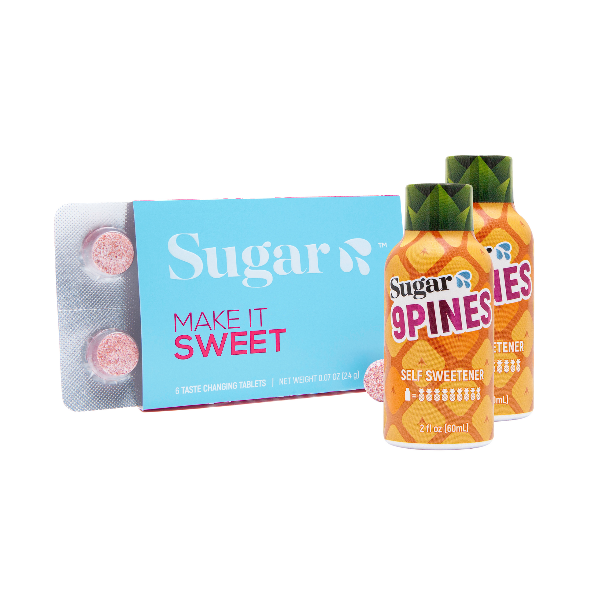 This bundle comes with 1 pack of our Sugar💦 taste changing tablets and 2 9Pines self-sweetening pineapple shots to take things up a notch....